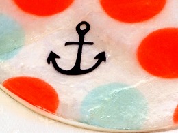 独特な光沢と透明感がきれいなカピス貝のコースター。天然素材を使用したナチュラルな仕上がり! 大きなドット柄とマリン風イカリマークが可愛い♪ |