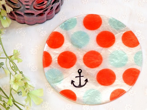 独特な光沢と透明感がきれいなカピス貝のコースター。天然素材を使用したナチュラルな仕上がり! 大きなドット柄とマリン風イカリマークが可愛い♪ |