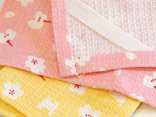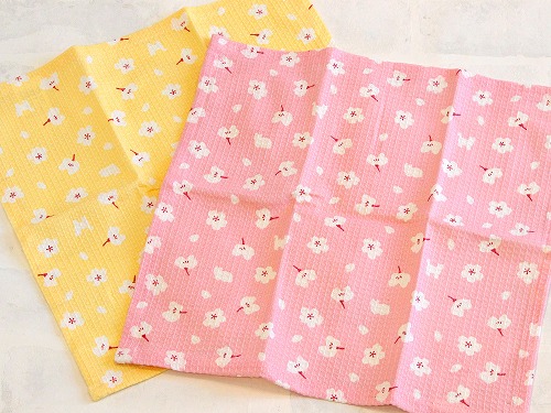 | ネコと桜モチーフが舞う、華やかなデザイン♪生地は吸水性の良いワッフルベース。 イエローとピンクの2色1セットです。 |