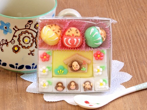 縁起物のだるまと、2016年の干支のさるをモチーフにした1つ1つ手作りの シュガークラフトセット。可愛らしくティータイムを演出してくれます! |