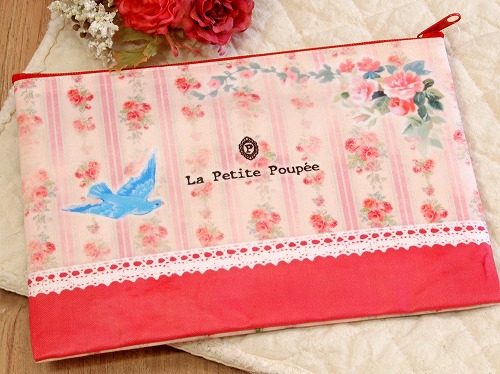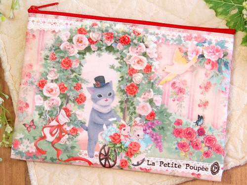 「プティット・プペ」シリーズは、おとぎの国のように美しく、楽しく、夢いっぱい♪ マチが無いペタンコポーチはすっきり収納できて、持ち運びに便利! 筆記用具入れにもどうぞ!表面はPVCコーティング。猫のシャルルは薔薇が大好き! |